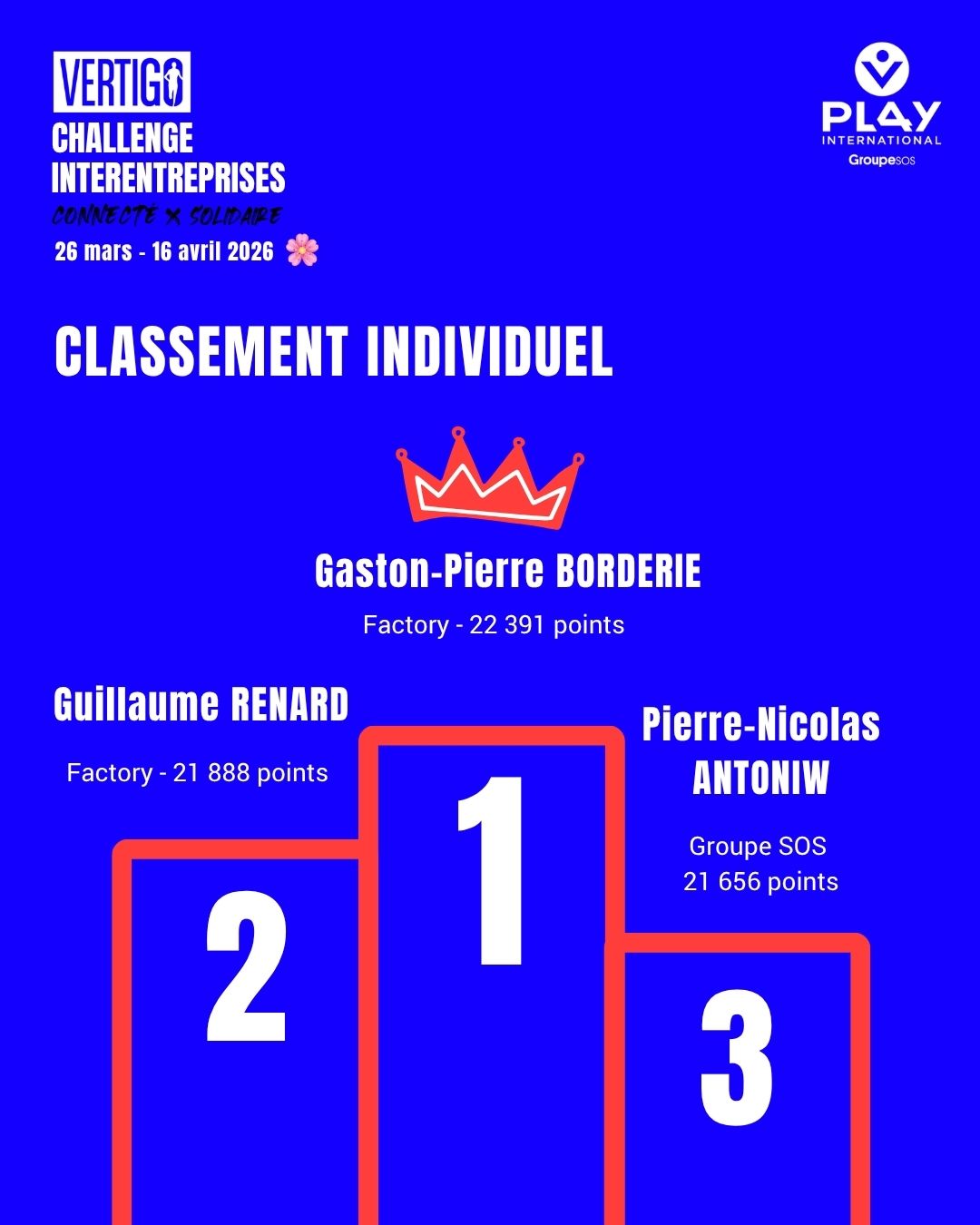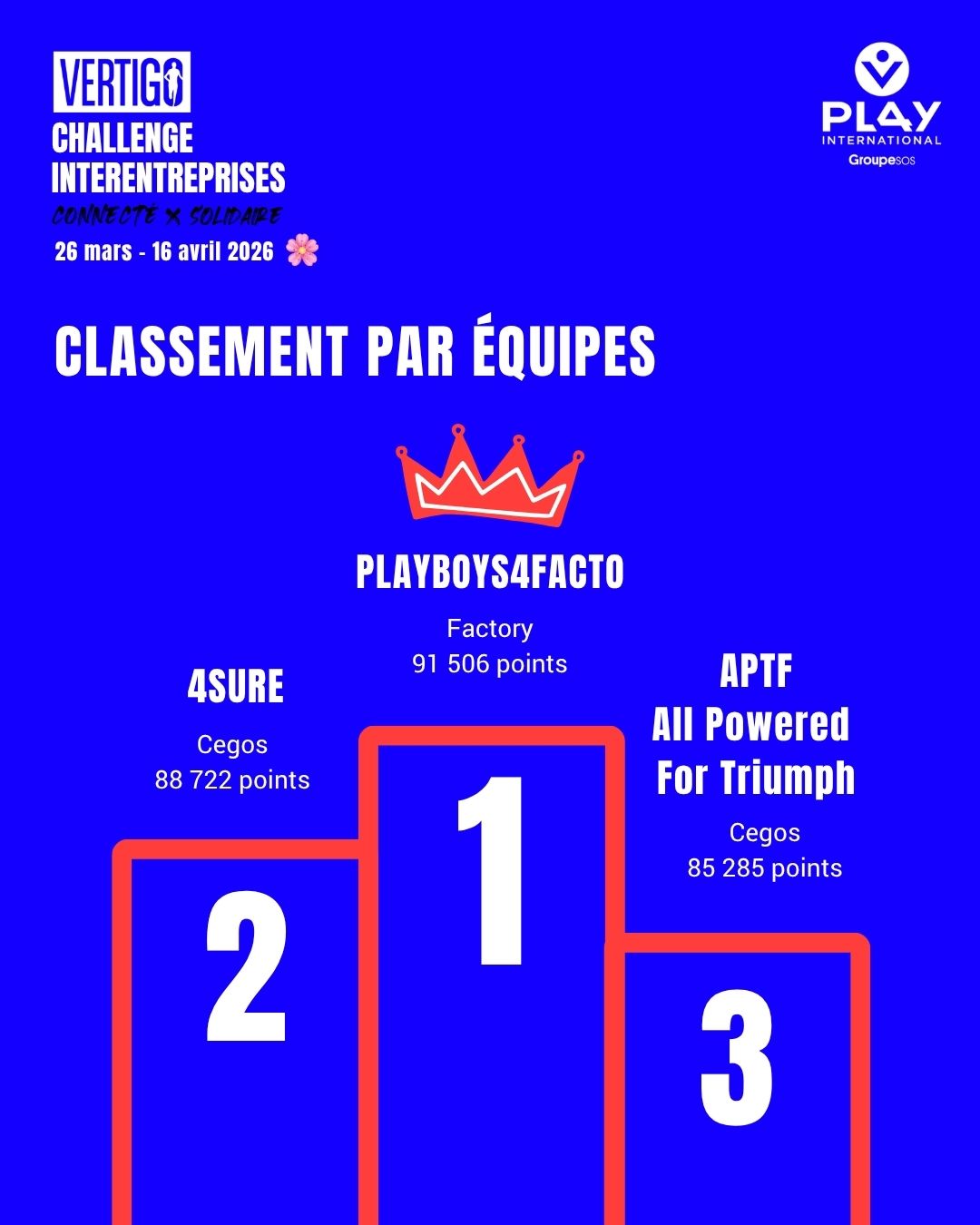 Félicitations à l’équipe « PLAYBOYS4FACTO » de Factory qui remporte la 7ème édition du Vertigo Challenge - Session printemps avec 91 506 points ! Elle est suivie par deux équipe de Cegos « 4SURE » avec 88 722 points et "APTF" avec 85 285 points.