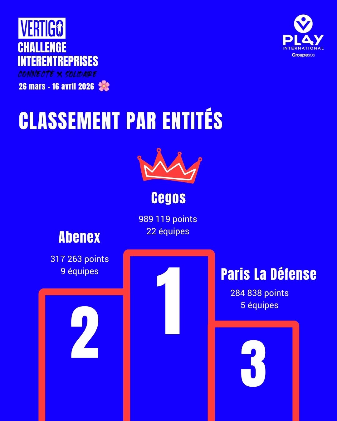 Pour les entreprises, Cegos conserve son titre avec 989 119 points, suivi par Abenex qui a collecté 317 263 points et enfin Paris La Défense avec 284 838 points.