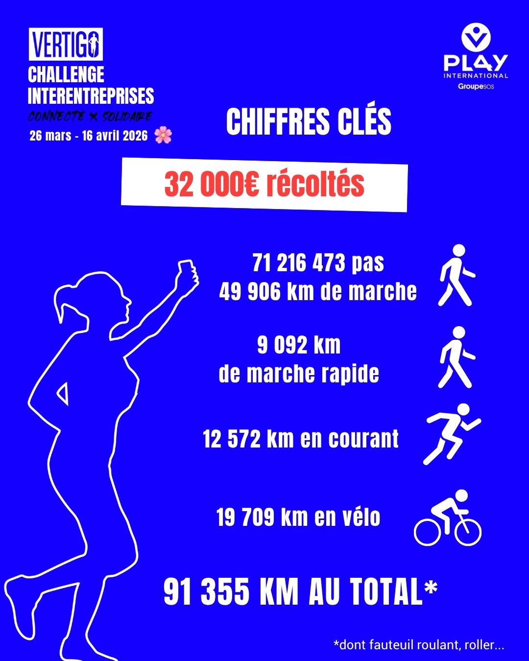 Par équipe de 4, les 316 participants et 82 équipes ont donc parcouru 91 355 km à pied, en courant ou à vélo pour un total de 32 000€ collectés au profit de PLAY International. Cette somme permettra à l’association de continuer à développer ses programmes en France et à l'international.