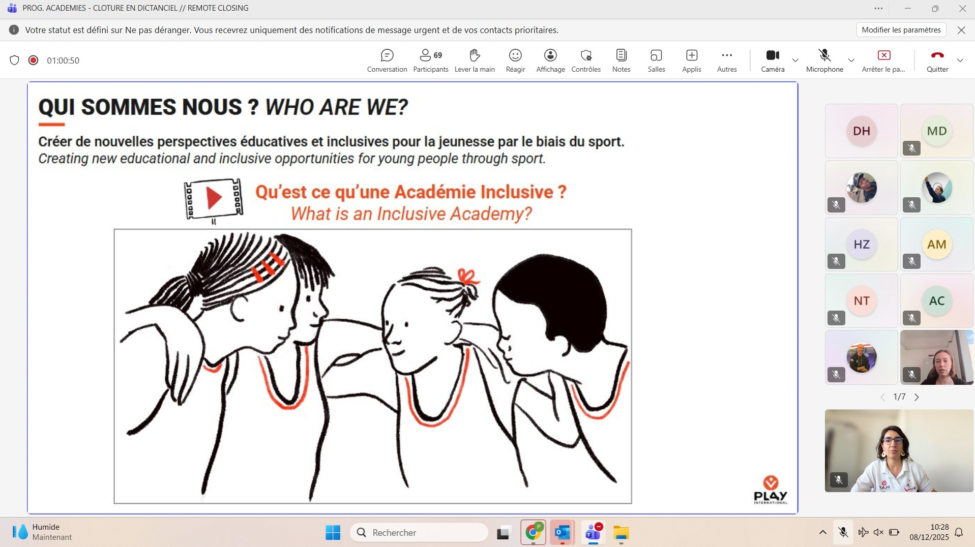 Le 8 décembre, une rencontre symbolique marquant la clôture officielle du programme s’est tenue en distanciel. Cet événement a réuni, aux côtés de l’AFD, l’ensemble des académies engagées dans le programme ainsi que les collaborateurs de PLAY International et de l’Institut Diambars, pour un moment collectif de partage, de valorisation et de reconnaissance du travail accompli.