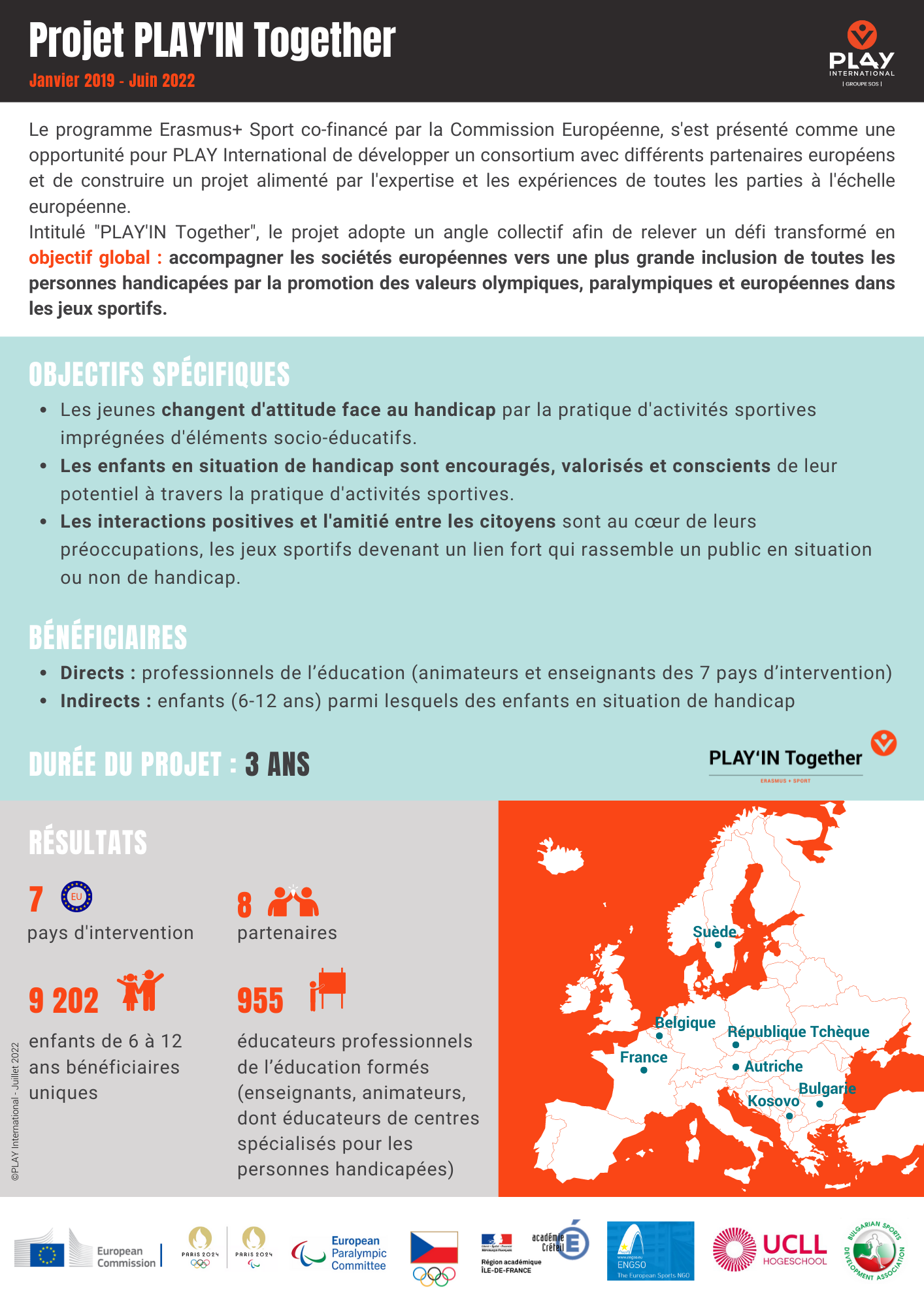 Convaincu que le sport peut être un facteur de changement social et de sensibilisation, PLAY International a donc été, en 2019, à l’initiative de la création d’un consortium de partenaires européens et a proposé à l’Union Européenne un projet visant à utiliser le jeu sportif comme outil de sensibilisation, d’inclusion, de progression sur la thématique du handicap.