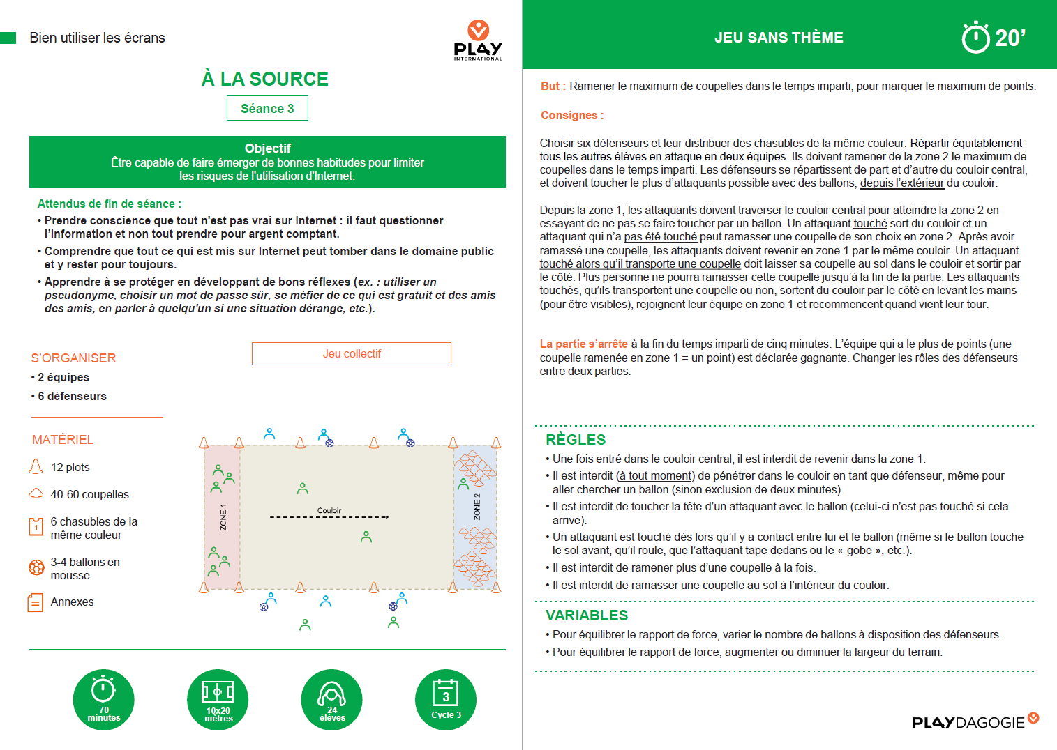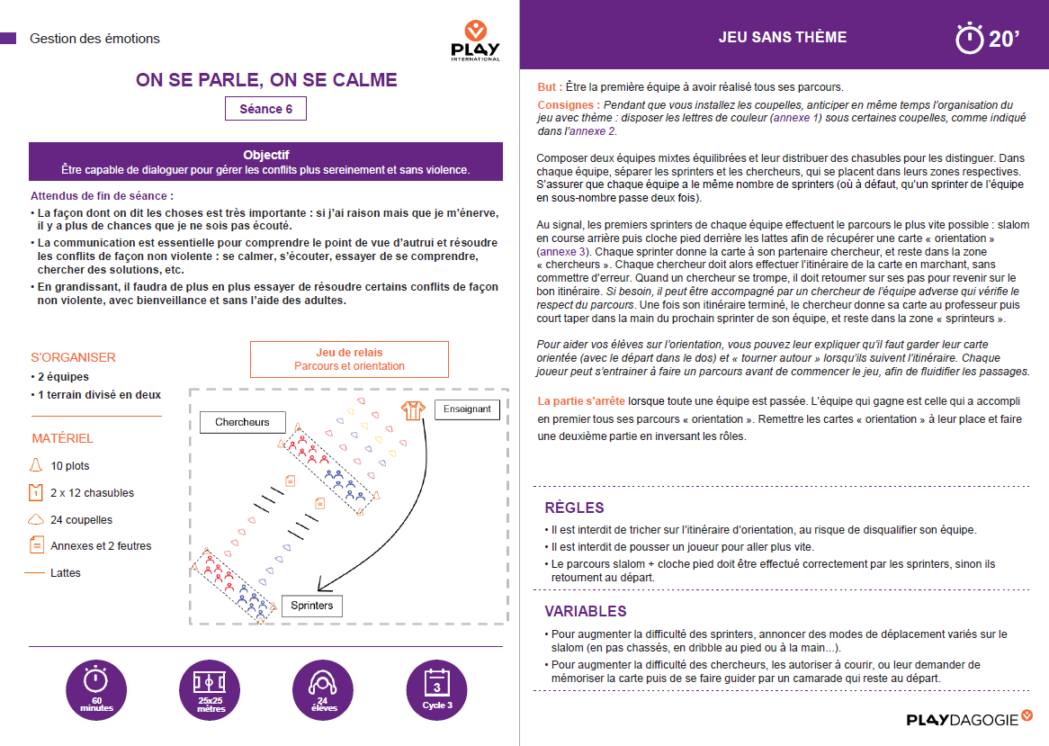 Ce kitpropose 10 sessions socio-sportives pour les enfants de 8 à 12 ans. Ces sessions sont conçues pour favoriser le développement des compétences psychosociales chez les enfants autour des concepts