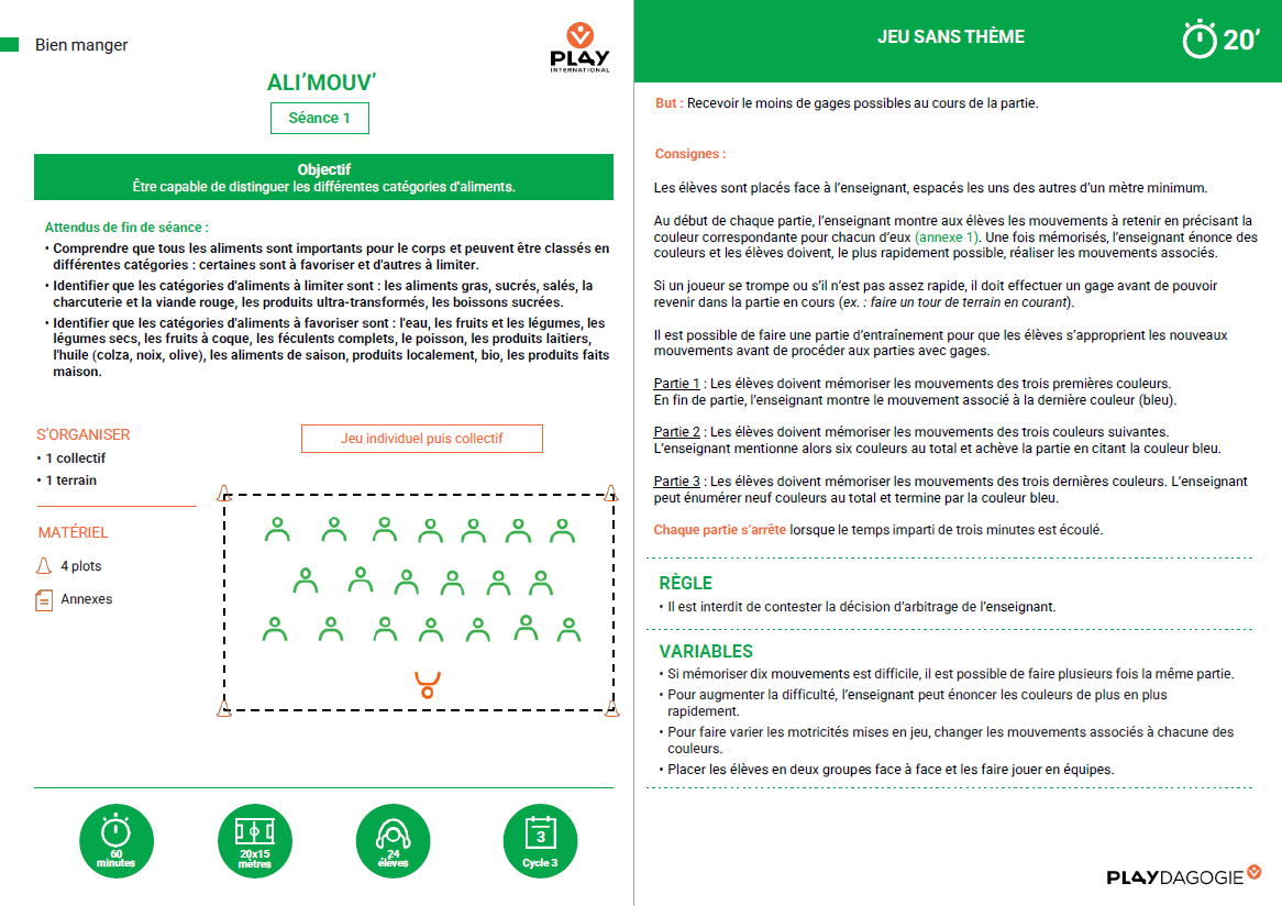 Grâce à différents supports de jeux, ce kit permet d’amener les enfants de 8 à 12 ans à découvrir les différents rôles de l'alimentation et la variété de catégories d'aliments qui existent, ainsi qu’à